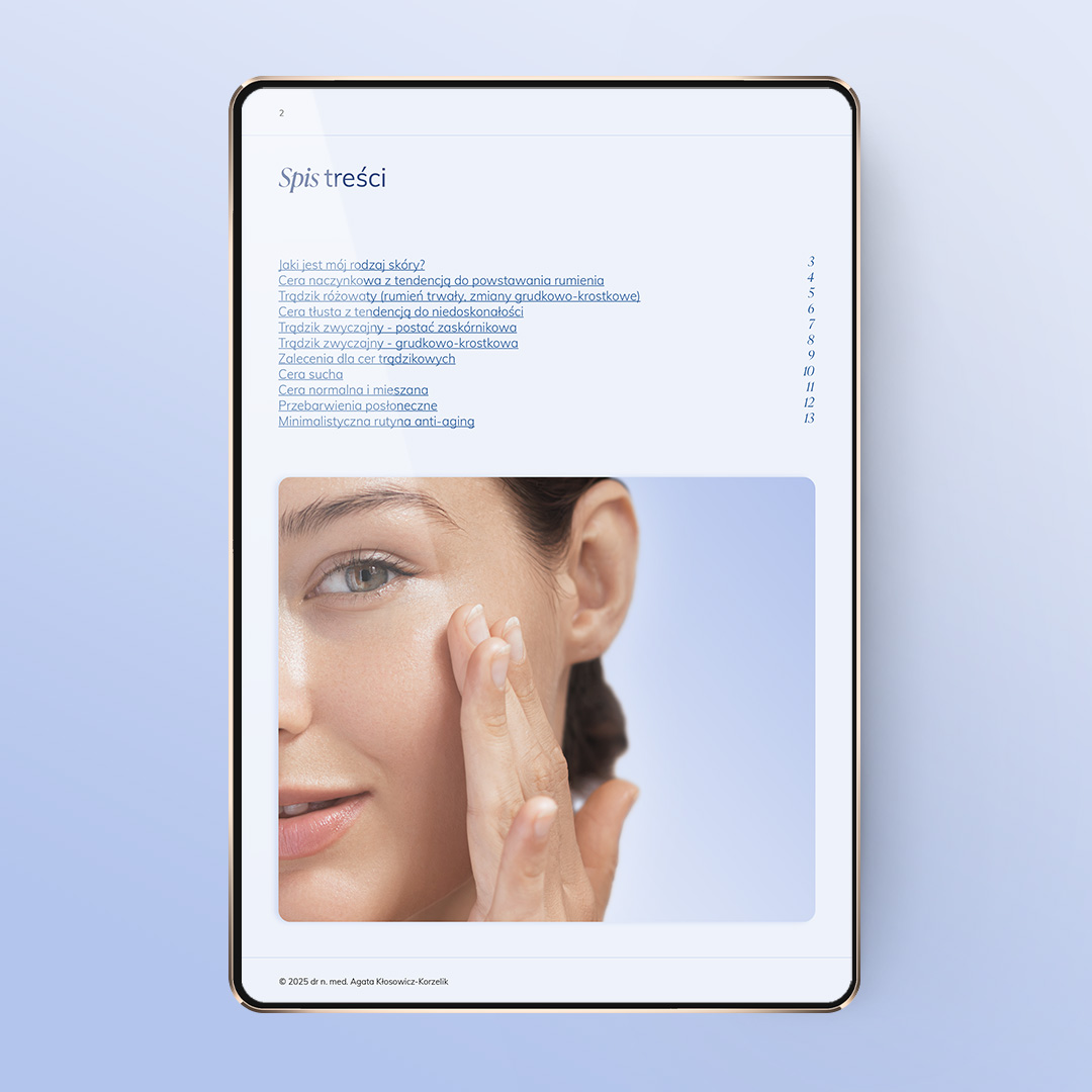Sam e-book jest esencjonalny – bez zbędnych treści i lania wody. Proponowane przez dr n. med. Agatę Kłosowicz-Korzelik dwuetapowe oczyszczanie okazało się dla mnie game-changerem. Moja skóra jest w dużo lepszym stanie – ma mniej niedoskonałości. Wcześniej kierowałam się poleceniami vlogerek/influencerek beauty albo sugestiami od dermatologów (ale często było czuć, że to sponsorowane). Efekt? Półka pełna kosmetyków i brak efektów. Teraz wreszcie czuję, że to działa. Duży plus za szczegółowe zalecenia dla cer trądzikowych i propozycje zabiegów medycyny estetycznej. Polecam ten e-book z całego serca ❤️.